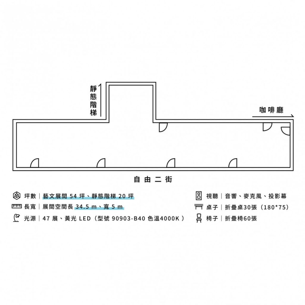 - 藝文展間 54 坪、靜態階梯 20 坪